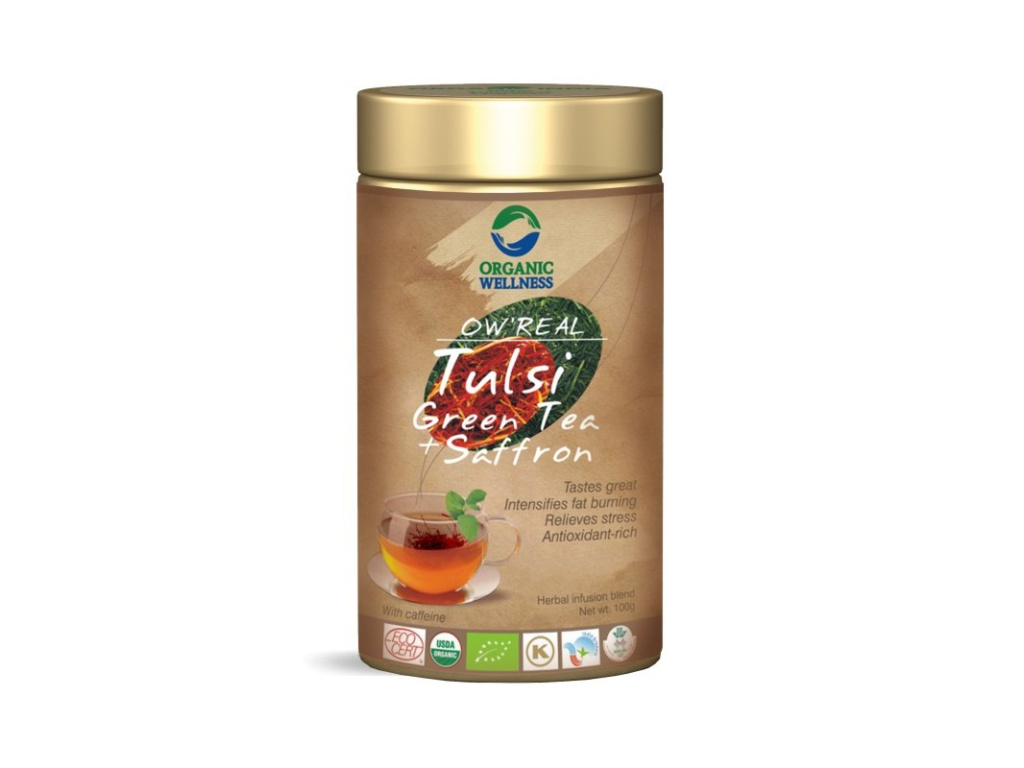 Čaj oslavuje synergii tří nejčistších bylin Tulsi (bazalky posvátné), zeleného čaje a exotického šafránu!